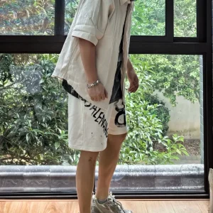 Bold and artistic, the Balenciaga BB Graffiti Logo Shorts make a strong statement with handwritten BLCG text and a large BB stencil-style graphic on the front. Paint splatter accents add a raw, urban vibe, delivering true streetwear energy. Made from soft, slightly stretchy cotton, the shorts offer a relaxed fit for effortless comfort. The back is kept clean with a single patch pocket to keep the focus on the front.