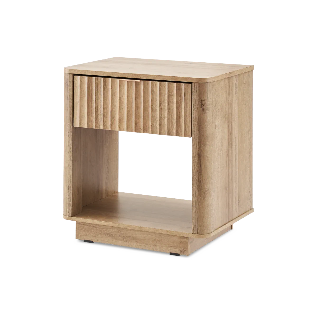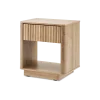 Featuring a unique fluted panel inspired by Art Deco and mid-century modern design, this piece combines elegant curves with a sleek frame for a refined yet safe finish. A rose gold aluminum handle adds a subtle touch of luxury, while the smooth-gliding drawer and open niche provide practical, accessible storage.