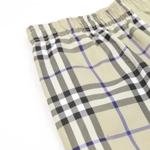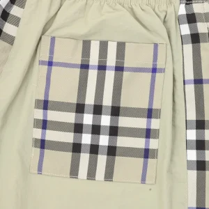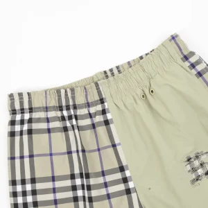 A creative twist on classic checks, these Burberry shorts contrast iconic beige plaid with soft green cotton panels for a dynamic, patchwork-inspired look. The rear pocket and front embroidery feature subtle branding, adding a refined edge. With a relaxed fit and elastic waistband, they blend comfort and modern flair, perfect for off-duty days with style.