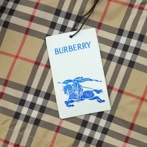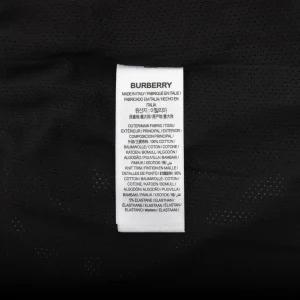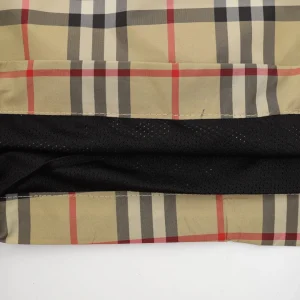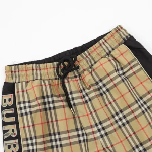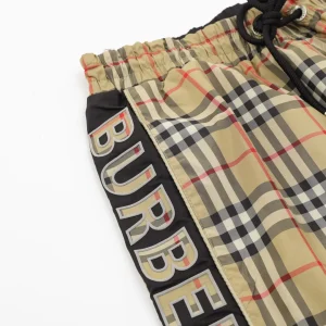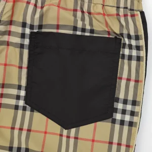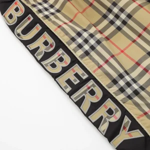 Crafted with signature vintage check canvas, these Burberry shorts feature contrast black panels along the sides and a bold “BUR” logo print down the left leg. The elasticated waistband with black drawcords ensures a snug, adjustable fit, while the back pocket in solid black cotton adds a modern, utilitarian touch. Perfect for infusing heritage pattern with street-ready edge.