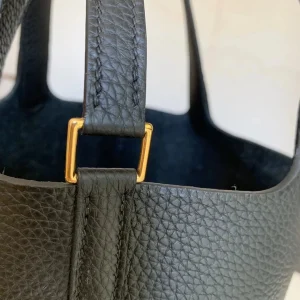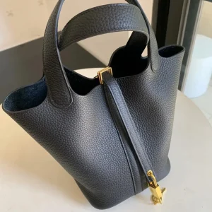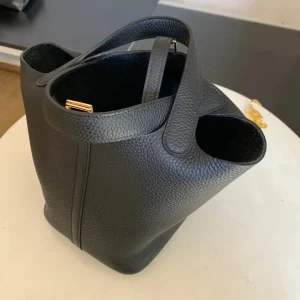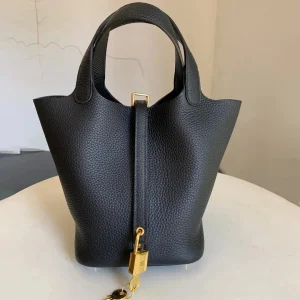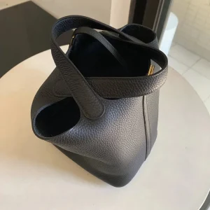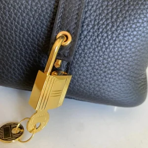 The HM Picotin Lock bag, crafted from supple, resilient Clemence leather, offers a rustic yet undeniably luxurious appeal. Its unique bucket shape and Hermes’ signature padlock closure create a distinctive look that effortlessly complements any style. An ideal choice for those who appreciate both practicality and sophistication.