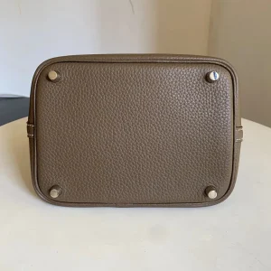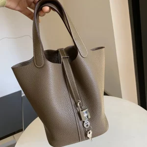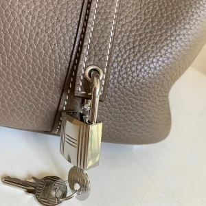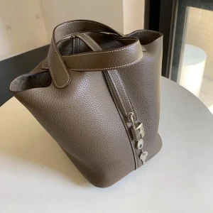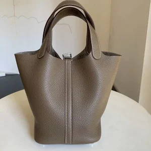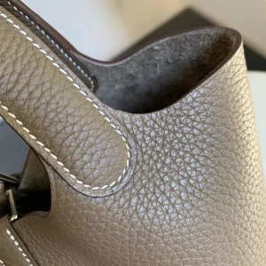The HM Picotin Lock bag, crafted from supple, resilient Clemence leather, offers a rustic yet undeniably luxurious appeal. Its unique bucket shape and Hermes’ signature padlock closure create a distinctive look that effortlessly complements any style. An ideal choice for those who appreciate both practicality and sophistication.