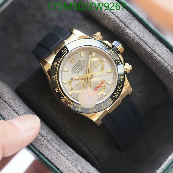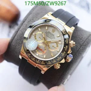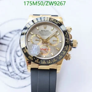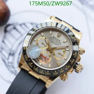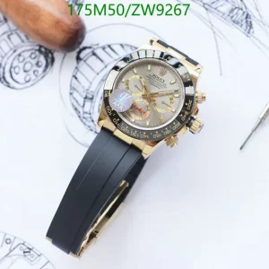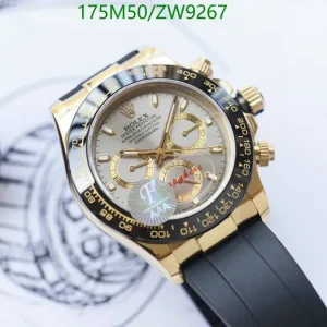 This brand-new Rolex Cosmograph Daytona boasts a 40mm Oyster case in solid 18k yellow gold, featuring striking polished and brushed finishes. Its Cerachrom bezel, similar to steel versions, now sports elegant yellow numerals. The vibrant yellow dial with gold markers, sub-dial rings, and luminescent hands radiates brilliance. Paired with a comfortable, durable Oysterflex rubber strap, reinforced with a steel frame, it offers supreme wearability. Powered by Rolex’s exclusive Caliber 4130 automatic movement, a Superlative Chronometer with precise chronograph and under 2-second daily deviation