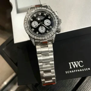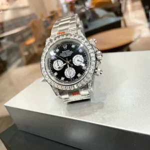 This certified brand-new Rolex Cosmograph Daytona features a stunning 36mm white gold case adorned with baguette diamonds and a screw-down crown. The elegant steel dial with baguette diamond markers adds a luxurious touch, while the Swiss-tested automatic movement ensures precise timekeeping. The watch is finished with a high-quality rubber strap and a folding Oysterlock safety clasp, offering both style and comfort on your wrist. Perfect for the modern man with an eye for luxury.
