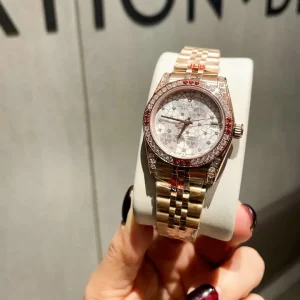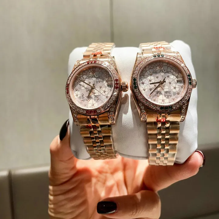 This Rolex Datejust impresses with its iconic Datejust profile, merging classic allure with modern touches. This exquisite timepiece features a robust Oyster case and luxurious President bracelet, both meticulously crafted from radiant 18k Everose gold. A dazzling diamond-set bezel beautifully frames a unique floral-motif dial, adorned with sparkling diamond hour markers. Paired with slender hands, this design achieves perfect harmony. Further enhancing its sophisticated appeal are a practical date window at 3 o’clock and a durable scratch-resistant sapphire crystal.