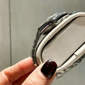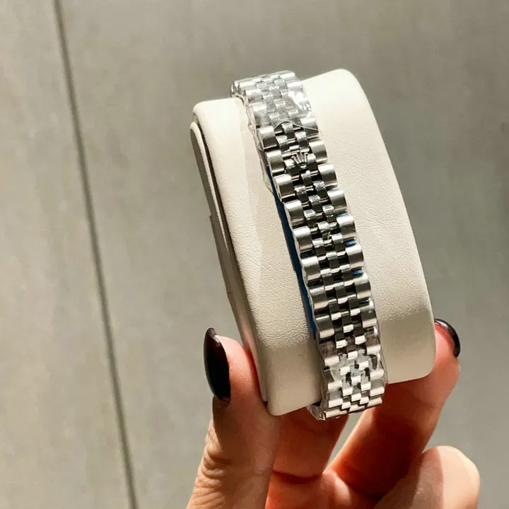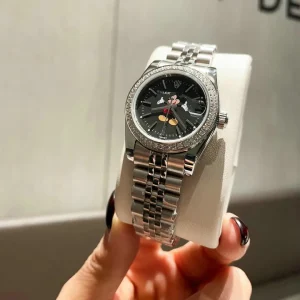 The Rolex Datejust harmoniously blends 18k white gold and Oystersteel with Mickey custom on the dial and 46 diamonds, creating a timepiece of exceptional beauty and durability. Its captivating diamond-set 18k white gold bezel exudes luxury, perfectly complementing the exquisite white mother-of-pearl dial adorned with diamond hour markers. This watch is a testament to Rolex’s dedication to refined perfection and timeless elegance, making it a truly desirable statement piece.
