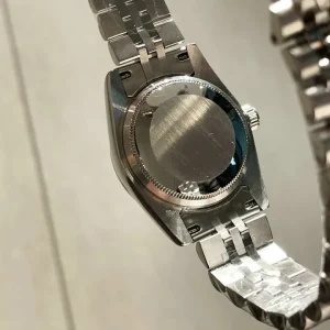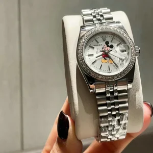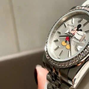 The Rolex Datejust harmoniously blends 18k white gold and Oystersteel with Mickey custom on the dial and 46 diamonds, creating a timepiece of exceptional beauty and durability. Its captivating diamond-set 18k white gold bezel exudes luxury, perfectly complementing the exquisite white mother-of-pearl dial adorned with diamond hour markers. This watch is a testament to Rolex’s dedication to refined perfection and timeless elegance, making it a truly desirable statement piece.