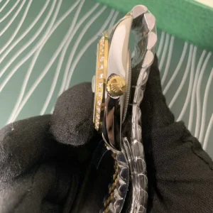 This Rolex Datejust captivates with its steel and 18k yellow gold case and bracelet, crowned by a diamond-set bezel. The striking white dial features diamond-set hour markers and baton hands, ensuring clear time display. This harmonious design offers supreme elegance. Inside, the automatic Caliber 3235 movement delivers a 70-hour power reserve, ensuring durable operation in all conditions and suiting any daily style.