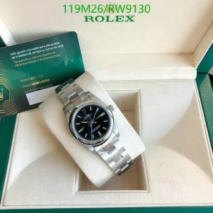 This Rolex Oyster Perpetual epitomizes global classic style, embodying timeless form and function derived from Rolex’s pioneering originals. Its sunray finish creates a subtle light reflection across the black dial, achieved through expert brushing techniques that radiate grooves from the center outwards. This unique diffusion of light across each facet produces an ethereal glow, captivatingly shifting with every movement of the wrist