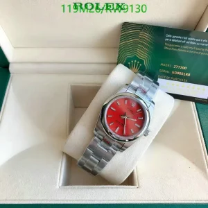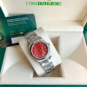 This Rolex Oyster Perpetual epitomizes global classic style, embodying timeless form and function derived from Rolex’s pioneering originals. Its sunray finish creates a subtle light reflection across the mercan kirmizi dial, achieved through expert brushing techniques that radiate grooves from the center outwards. This unique diffusion of light across each facet produces an ethereal glow, captivatingly shifting with every movement of the wrist