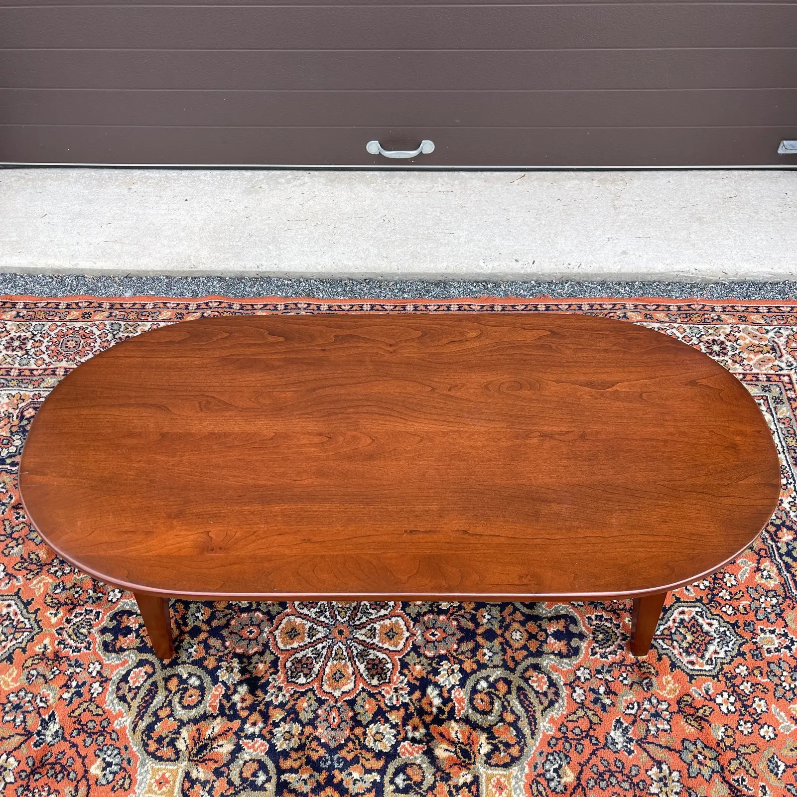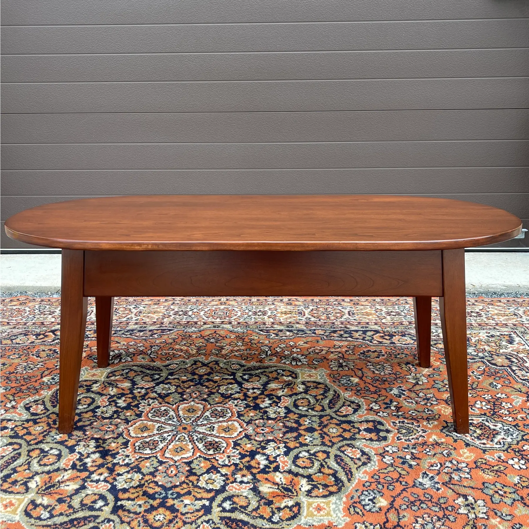 This Solid Cherry Oval Coffee Table showcases timeless American Shaker design, defined by its understated elegance, functional form, and enduring craftsmanship. Crafted from solid cherry wood, the table features a beautifully proportioned oval top supported by splayed, square tapering legs, offering both visual balance and structural stability.