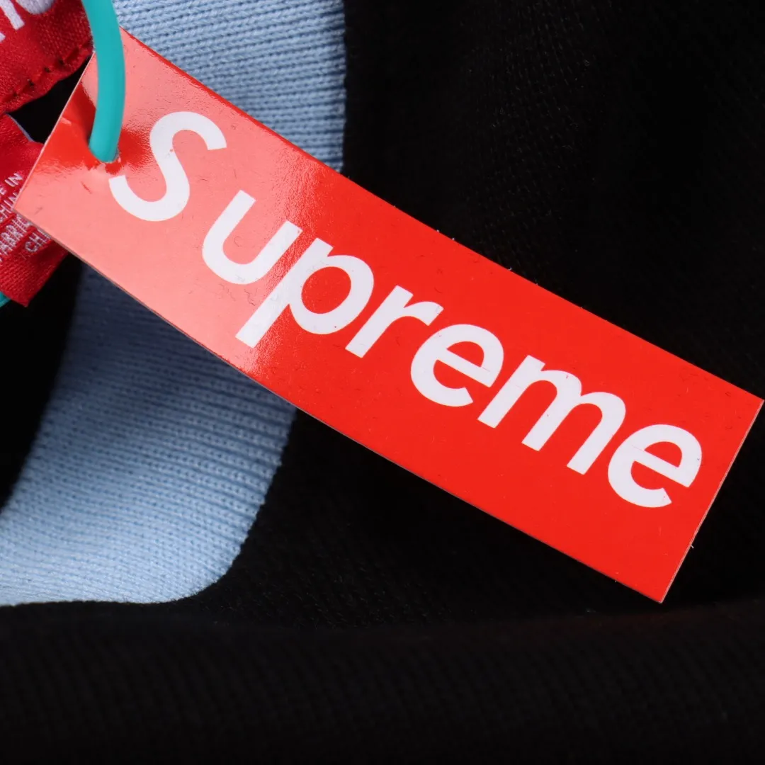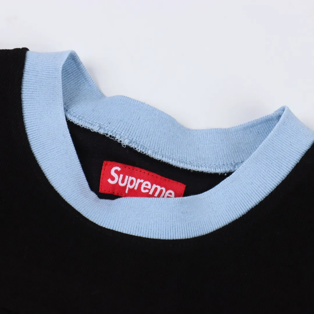 Bold and nostalgic, this SUP jersey-style tee channels varsity energy with a modern twist. Dominated by a standout “94” on the chest, it’s paired with the signature SUP branding in vibrant yellow for maximum contrast. Light blue ribbed collar and shoulder stripes add athletic vibes, while the premium black cotton base delivers everyday comfort with a luxe streetwear finish. Finished with the iconic SUP red label at the hem.